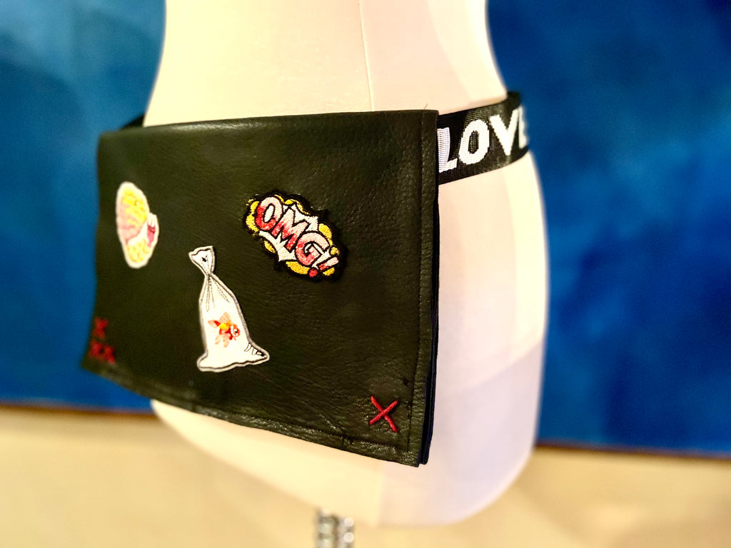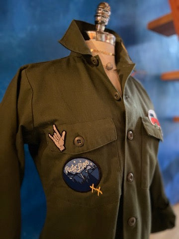 Levi's denim trucker jackets, jeans + camo pants, vintage army shirts & flight suits as well as Vintage LV + Gucci cross body bags and bum bags, along with 1 of a kind deer hide and canvas belt bags all with fun patches to make you giggle all day long.